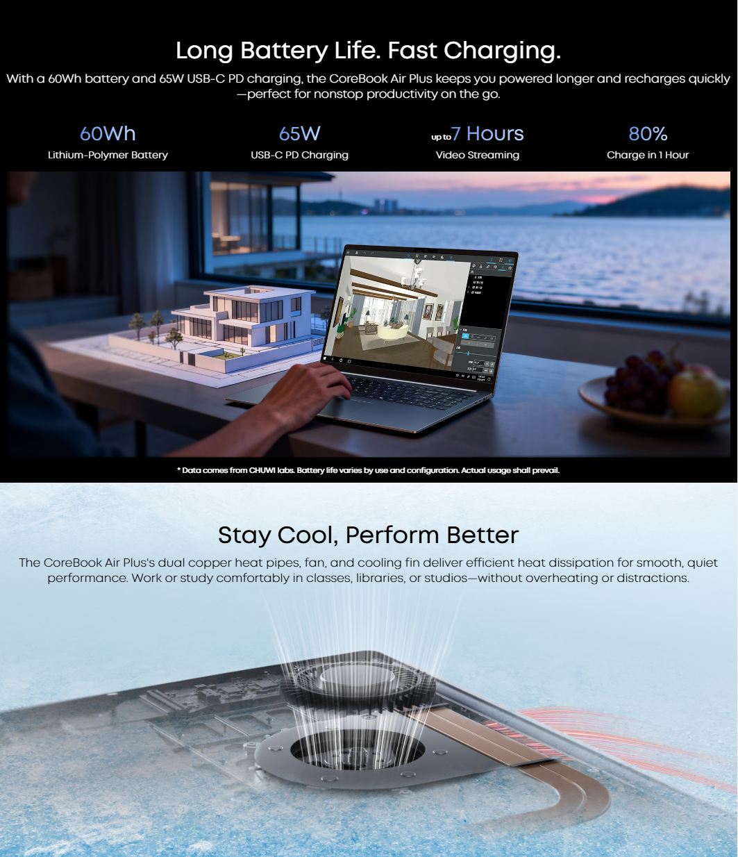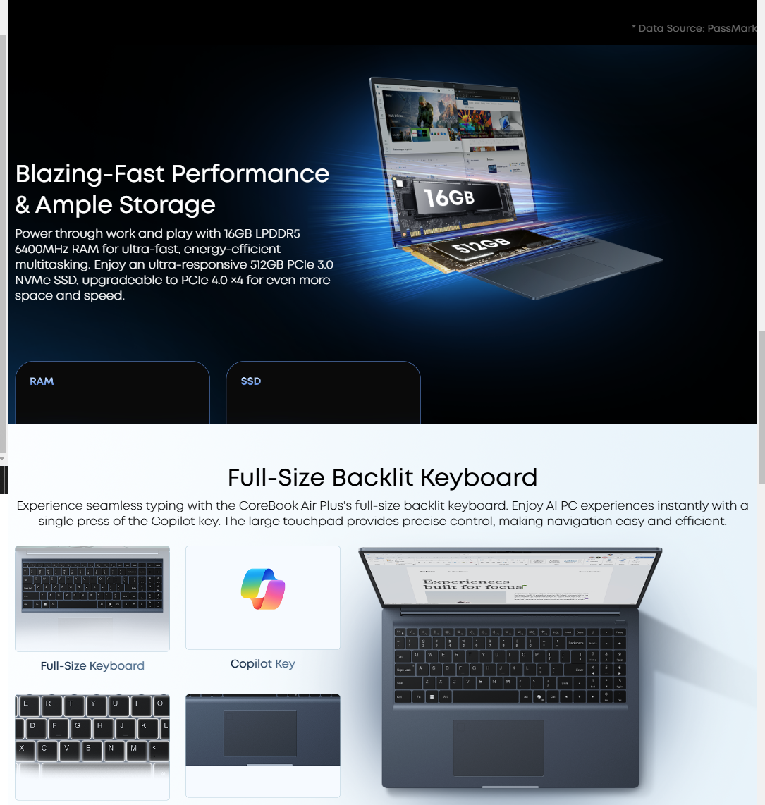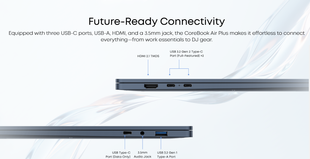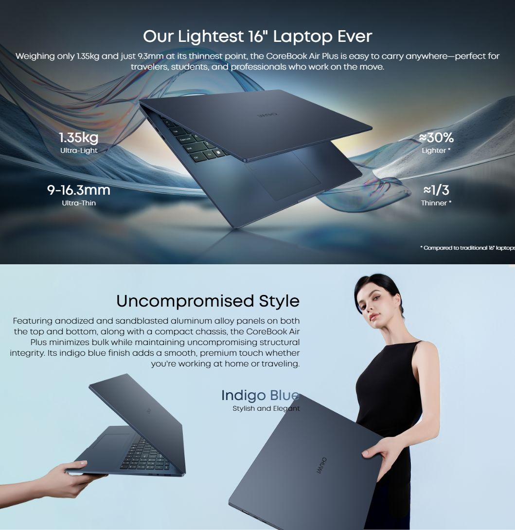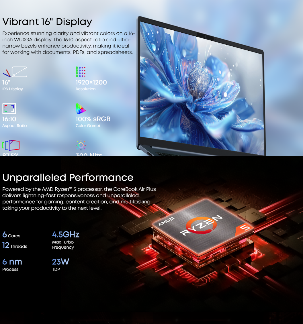 The all-new CoreBook Air Plus will begin shipping on January 30, 2026. 14" laptop weighing 1.35 kg: Weighing only 1kg and just 9mm at its thinnest point, the CoreBook Air is easy to carry anywhere—perfect for travelers, students, and professionals who work on the move. Dual Custom Box Speakers, Meticulously Tuned: Enjoy clearer voices, richer audio, and deeper bass with our expert-tuned dual box speakers. Perfect for video calls, movies, streaming, and music. Vibrant 16" Display:Experience stunning clarity and vibrant colors on a 16-inch WUXGA display. The 16:10 aspect ratio and ultra-narrow bezels enhance productivity。 AMD Ryzen™ 5 processor: Powered by the AMD Ryzen™ 5 processor with 6 cores and 12 threads, the CoreBook Air delivers lightning-fast responsiveness and unparalleled performance for gaming, content creation. AMD Radeon™ 660M:The RDNA2-based AMD Radeon™ 660M with 6 CUs (up to 1900 MHz) boosts gaming visuals, multimedia, and streaming. 16GB LPDDR5+512GB PCIe 3.0 NVMe SSD: Power through work and play with 16GB LPDDR5 6400MHz RAM. Enjoy an ultra-responsive 512GB PCIe 3.0 NVMe SSD, upgradeable to PCIe 4.0 ×4 for even more space and speed.