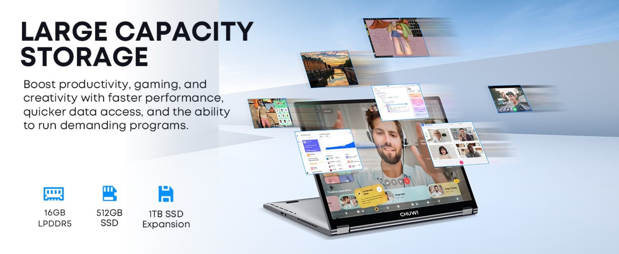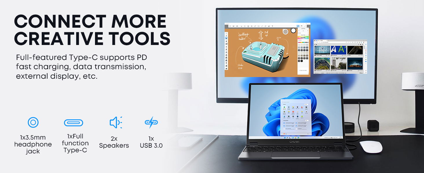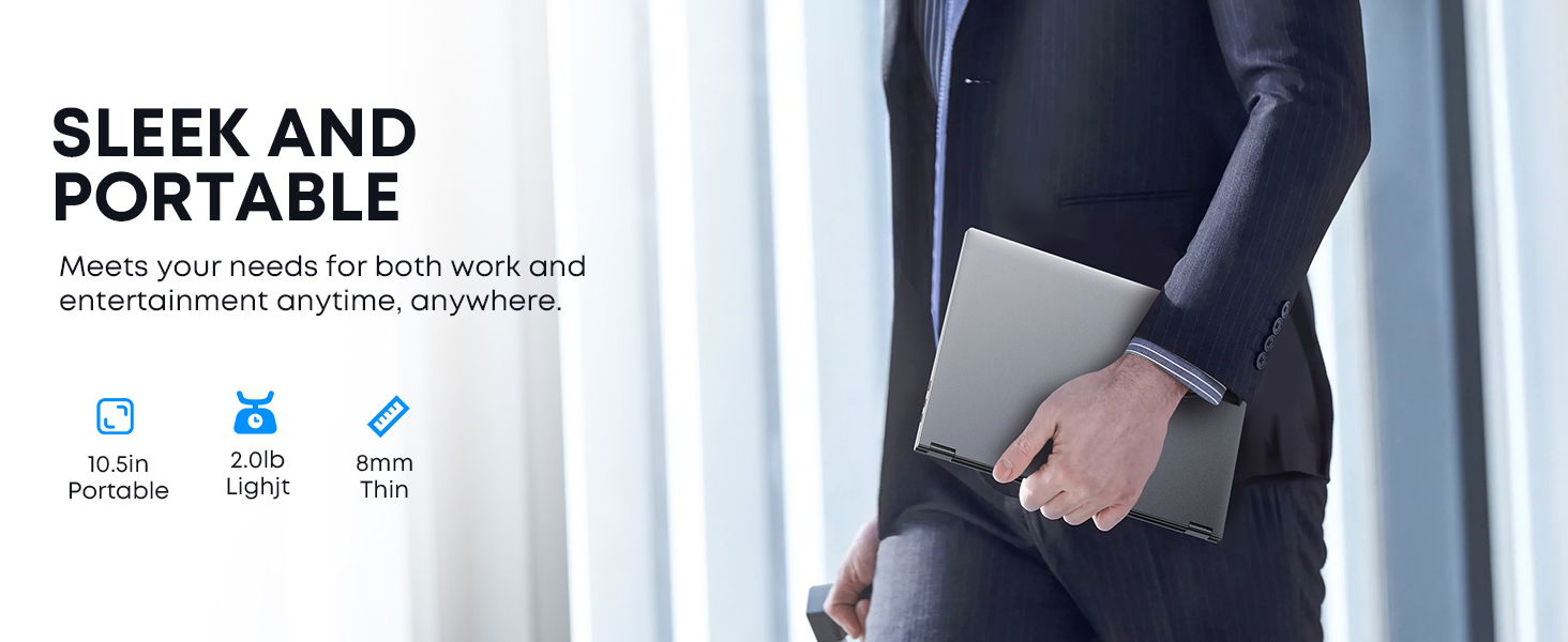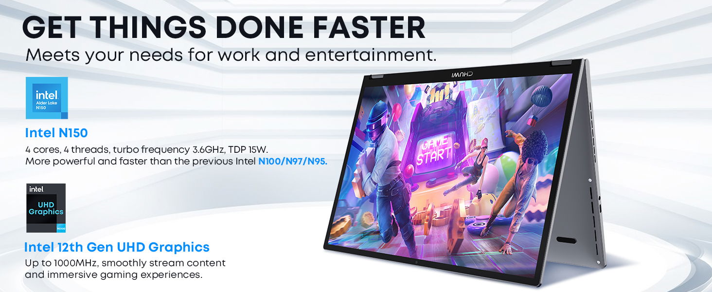 16GB LPDDR5+512GB SSD: CHUWI MiniBook X Windows 11 Laptop with the newest 12th Gen Intel N150(4C/4T, Up to 3.6GHz, TDP 15W) and the 12th Gen Intel UHD Graphics easily meets your multitasking, gaming, and web browsing needs. 16GB LPDDR5 and 512GB SSD provide ample storage and ensure efficient multitasking. Support M.2 2280 SSD expansion up to 2TB. 2-in-1 Touchscreen Laptop: CHUWI MiniBook X laptop 360° flip design allows for a variety of usage modes, including tent and tablet mode, perfect for streaming movies, reading long-form articles, or even drawing. The sleek metallic body adds a touch of elegance and durability. The thinnest part at just 0.31in and a light 1.96lb weight, this portable laptop is the ideal travel companion. With cooling fan provides efficient heat dissipation, enhanced performance, and quiet operation. Stunning 2K Visuals: This 10.51-inch touchscreen laptop with a 1920*1200 resolution ensures a superior visual experience. 100% sRGB coverage and a 16:10 aspect ratio, it offers a larger display area, enhancing productivity and ensuring every detail is crystal clear. Full-sized backlit keyboard featuring an ultra-narrow bezel layout, extending the typing area, and you can work efficiently even in the dark. "Fn+F5" can be used to toggle the backlight on or off. WiFi 6 & Bluetooth 5.2: Dual-band WiFi 6 and Bluetooth 5.2 offer fast and stable wireless connections for seamless online experiences. WiFi 6 is faster, more powerful, more reliable, more energy-efficient, and performs better in handling multiple devices compared to WiFi 5. This convertible laptop offers multiple connectivity options, including two full-function Type-C ports and a 3.5mm headphone jack. Superior Audio: Enjoy an immersive audio experience with the two high-quality speakers, delivering balanced output from high to low frequencies. This mini laptop has installed Windows 11 system, is out of the box, simple to use, automatic upgrades at no additional cost.