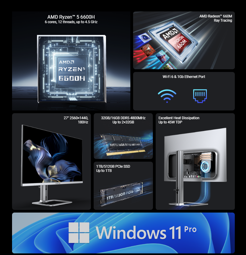 Chuwi Unitech 27″ AIO Computer 2560*1440 (2K) Ryzen 5 6600H 16Gb 1Tb Windows 11 Pro Without Keyboard/Mouse CHUWI Unitech 27 – Description The CHUWI Unitech 27 is a modern all-in-one computer that combines elegant design with high performance. Equipped with an AMD Ryzen™ 5 6600H processor , AMD Radeon™ 660M graphics , and a 27-inch 2K 180Hz display , it offers a fluid experience for both productivity and entertainment. With NVMe SSD storage options, next-generation connectivity with Wi-Fi 6 and Bluetooth 5.2 , and support for up to 64GB of DDR5 RAM (32GB included in this model) , this device is ideal for those looking for power in a compact format.